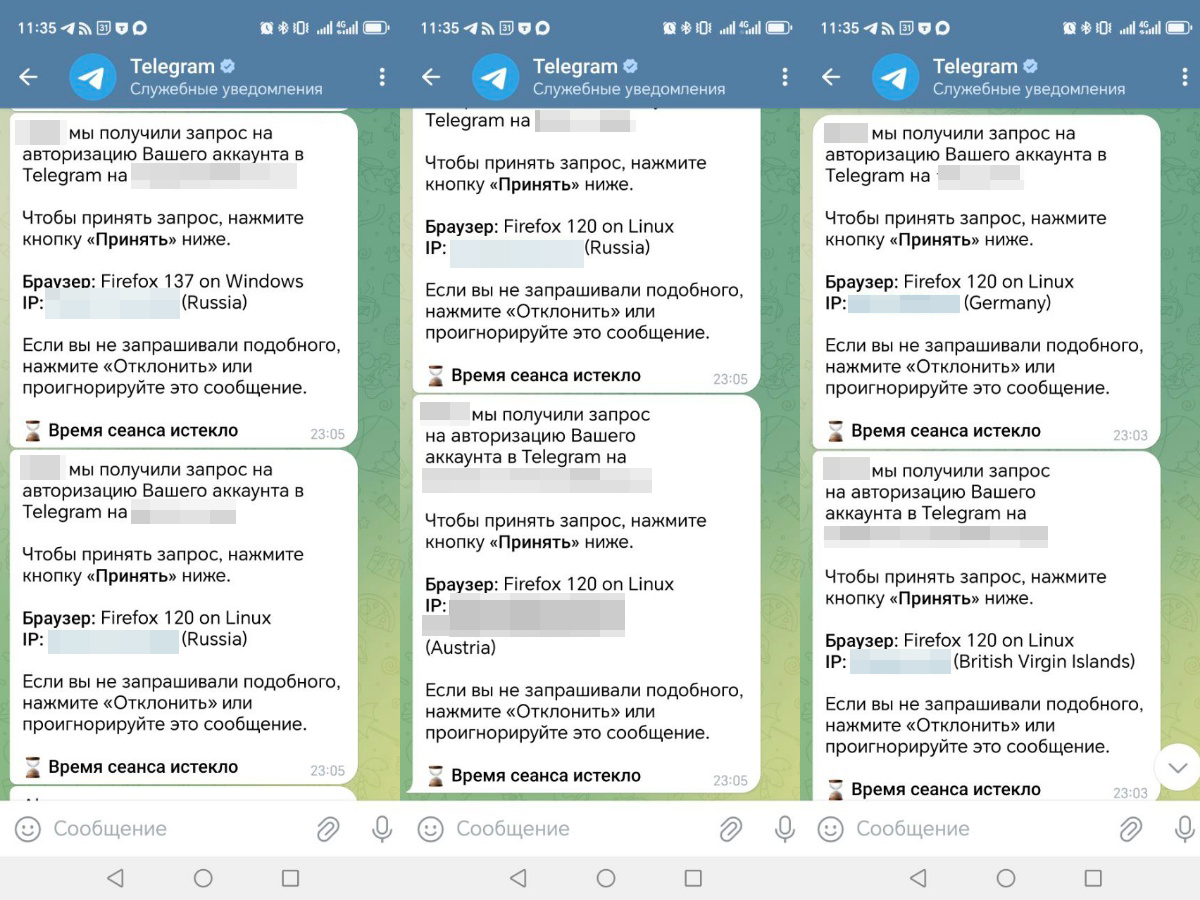 «Я открыл письмо с телефона — обычно с компьютера смотрю, а тут просто стало интересно. Там была тема, знакомая и полезная для нас. Я нажал на кнопку "Прочитать статью полностью" — и всё, телефон завис, появился белый экран с кодами», — рассказывает один из пострадавших журналистов.Сначала показалось, что ничего страшного не произошло. Однако спустя несколько часов начались массовые попытки входа в Telegram-аккаунт с разных стран и браузеров. Телефон буквально захлебнулся от SMS-сообщений с кодами подтверждения.