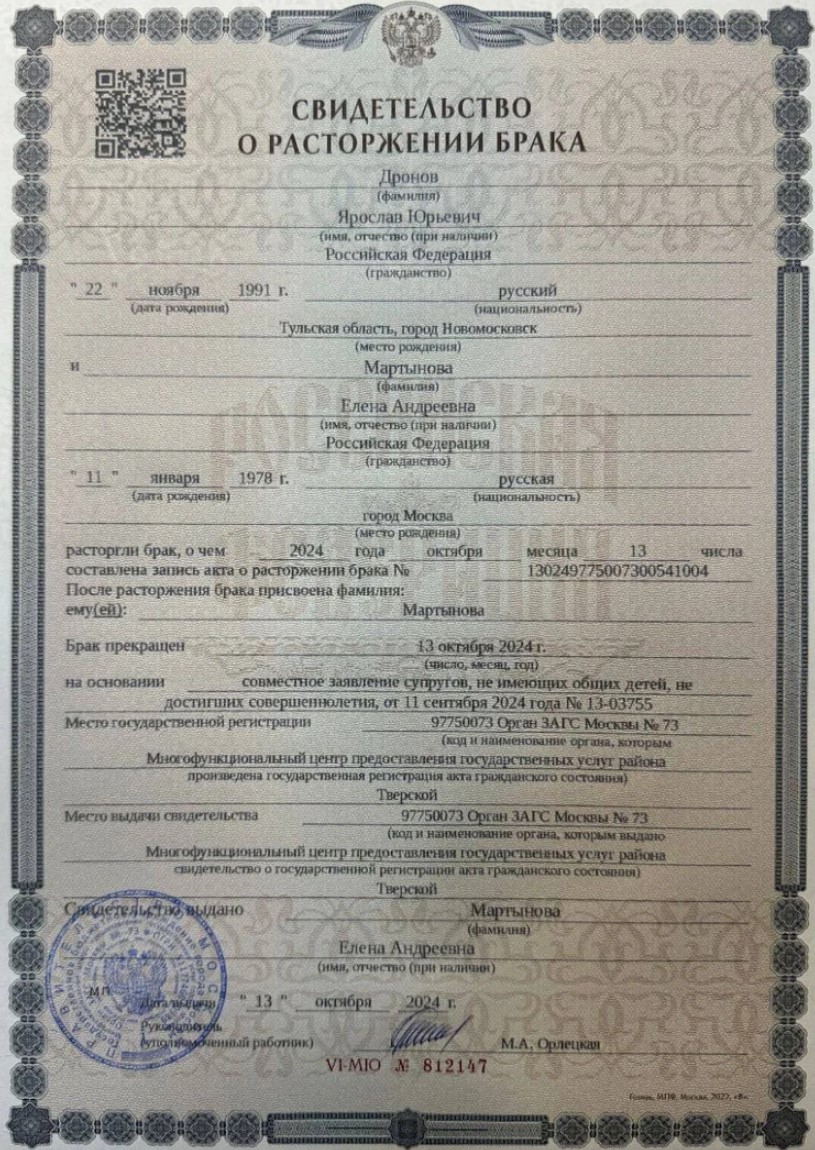 Известный певец Shaman (Ярослав Дронов) официально развелся со своей 46-летней женой — топ-менеджером компании «Мегафон» Еленой Мартыновой. Развод был оформлен 13 октября 2024 года. Об этом Shaman сообщил в своем Telegram-канале, разместив копию свидетельства о расторжении брака.