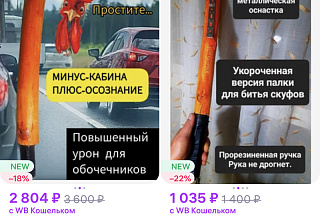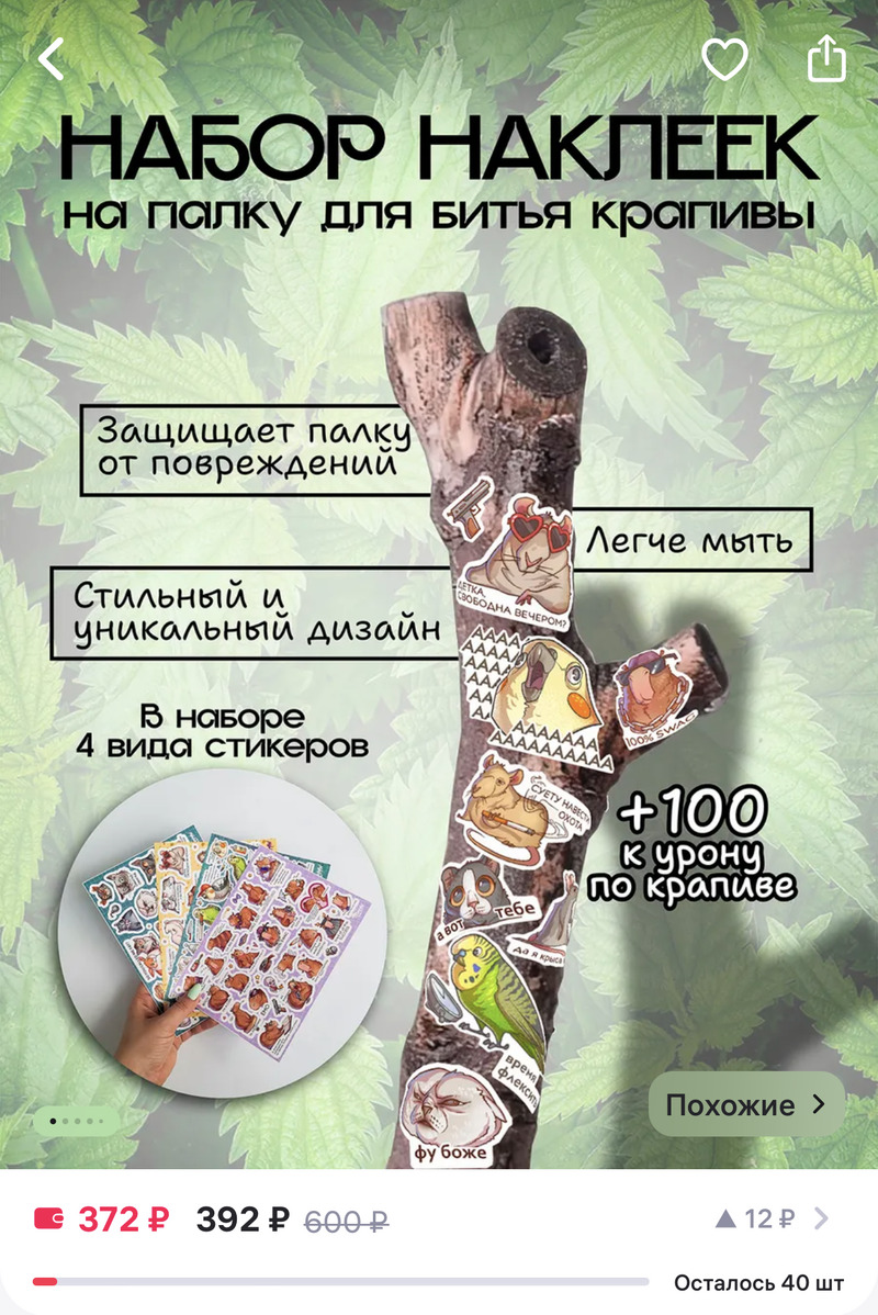 "Шикарное приобретение — многопрофильное! Сначала я порадовала себя очередной покупочкой, потом любимого (чтобы он не говорил, что мои покупки — бесполезные). Потом он порадовал собаку, передарив ей палку. В общем, сплошной круг радости", — делится впечатлениями восторженная покупательница.Палка стала популярной настолько, что к ней отдельно начали продавать наклейки, чехлы и губки для мытья. Также на маркетплейсе можно приобрести "обложку на паспорт для владельцев палок для битья крапивы".