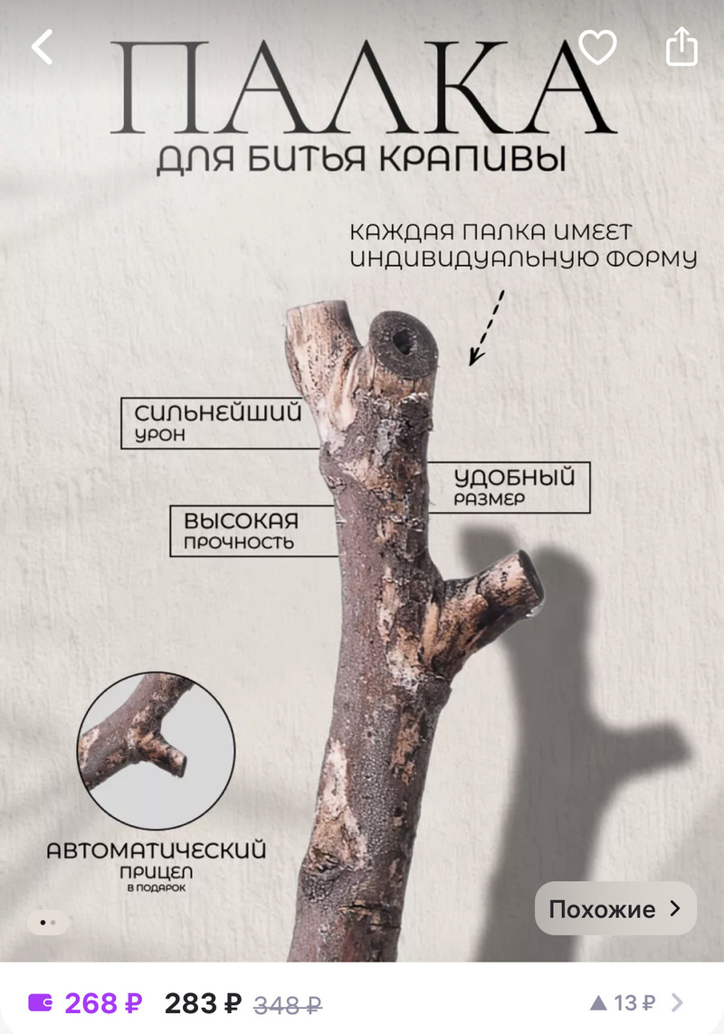 Палка для битья крапивы — товар сезонный, но пользуется неплохим спросом и осенью. Многие покупатели говорят, что по назначению палку использовать тяжело, особенно, если пришла маленькая. Однако она подходит и для других целей — отдать питомцам, сделать "массаж" и даже... побить кого-нибудь.