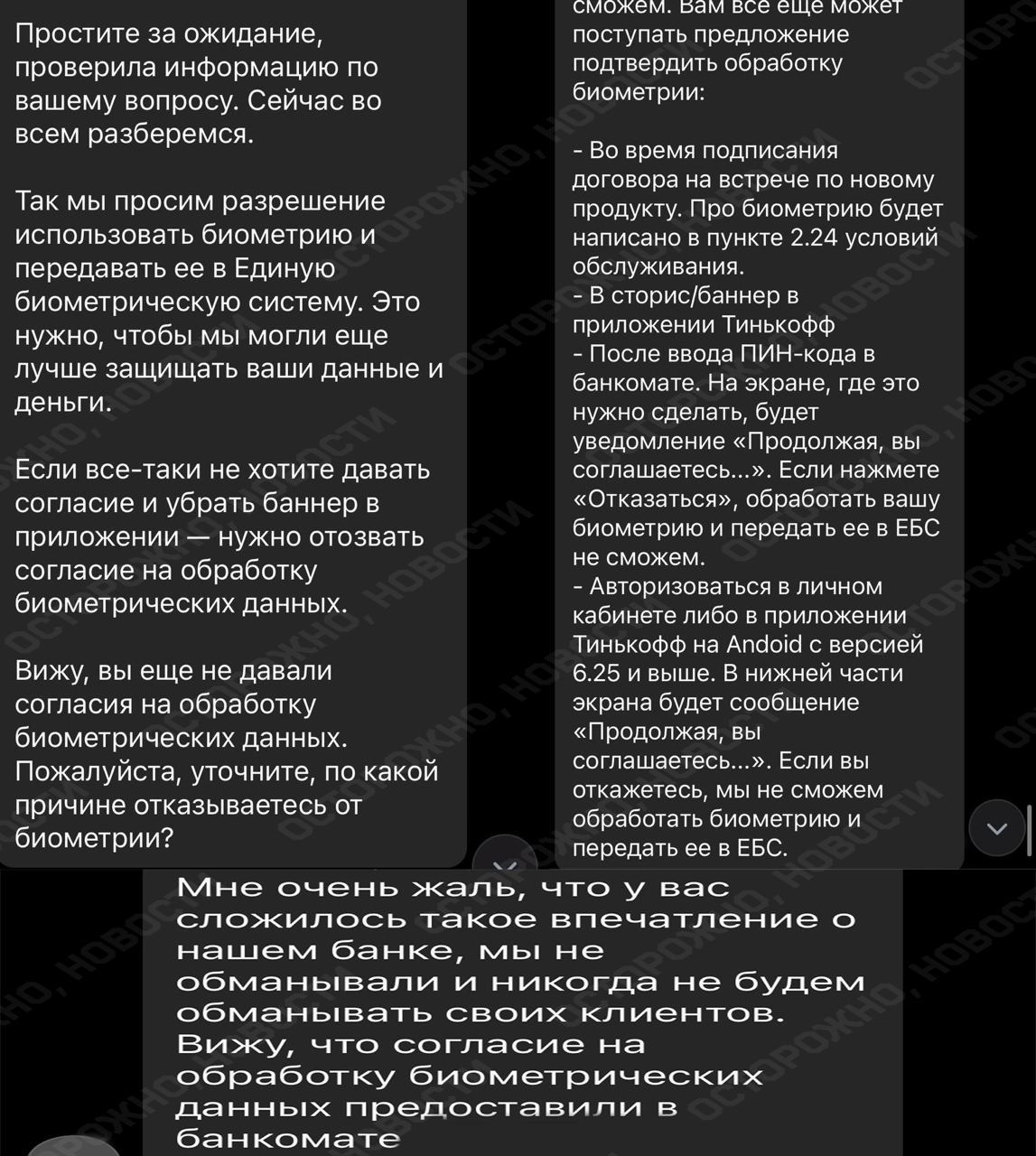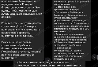 О том, что «Тинькофф Банк» передал клиентскую биометрию в «Госуслуги», узнал и журналист «Осторожно, новости» — несмотря на то, что в декабре просил банк больше не предлагать эту услугу. В поддержке ему заявили, что согласие было получено, когда он ввел пин-код в банкомате. Чтобы отменить это решение, вопрос пришлось решать через колл-центр банка. При этом согласие могут снова попробовать получить в любой момент: не зная всех условий, отказаться от этого клиенту очень сложно.