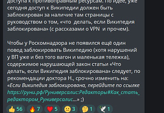 В телеграм-канале интернет-энциклопедии "Руниверсалис" 1 марта появился пост, в котором было сказано, что доступ к "Википедии" должен быть заблокирован "за наличие там страницы с руководством о том, «что делать, если Википедия заблокирована» (с рассказами о VPN и прочем)".
